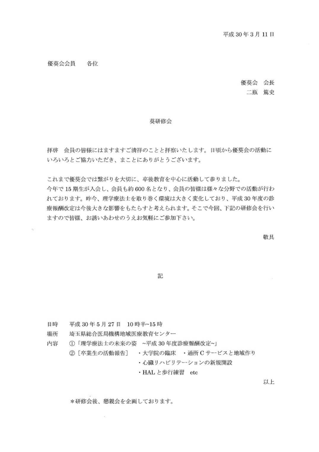 6期生に関してはLINEで『埼玉医療6期生グループ』を作成させていただき、そちらで参加・不参加の確認をさせていただいていますのでご回答の程宜しくお願いします!